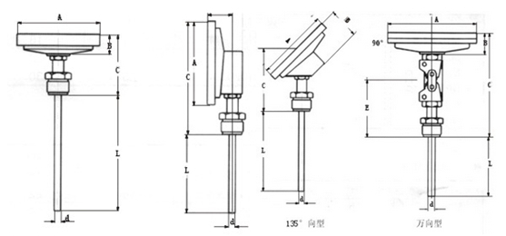 3、135°向型雙金屬溫度計(jì):指針盤與保護(hù)管成135°連接;